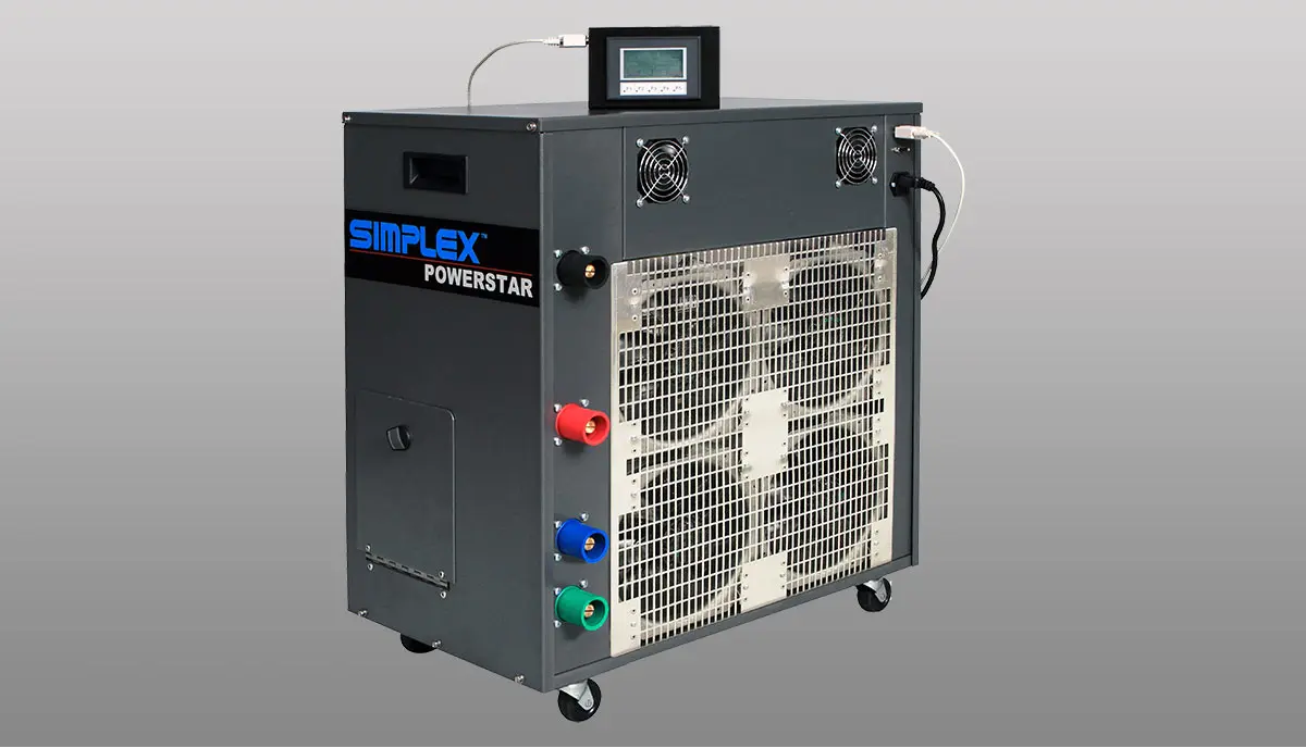 The Simplex PowerStar 110R is a portable resistive load bank rental, designed for manufacturers, dealers and users of small AC power systems. It is suitable for testing engine generators, wind generators, UPS systems, ground power units, auxiliary power units, static inverters or virtually any other AC power source on the production line, in the service shop or in the field. It can be applied at all common AC voltages to 480V maximum, 50 or 60 Hertz, single or 3-phase. The PowerStar is a digitally controlled load bank with network capability. Control is via a hand-held touchscreen controller connected to the load bank via a supplied RS-232 network cable. An aluminum "slip-over" cover with handles adds protection while transporting.